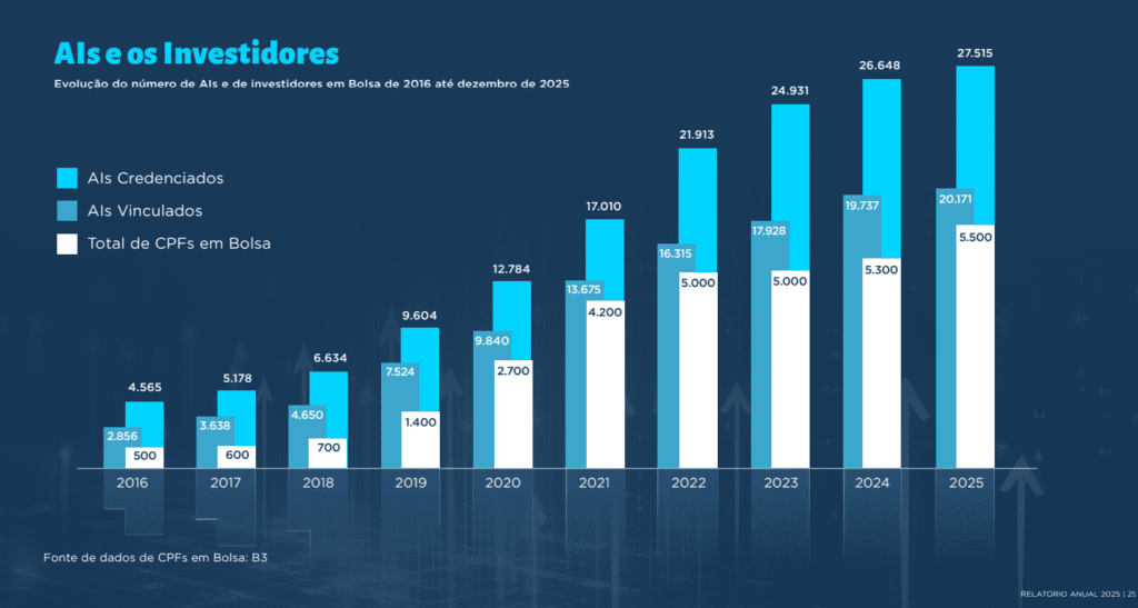 A ANCORD registra crescimento contínuo no número de assessores de investimento, atingindo cerca de 27.515 profissionais em 2025, consolidando a expansão da atividade no país. No período mais recente, o total evoluiu de 26.648 em 2024 para 27.515 em 2025, o que representa um crescimento anual de aproximadamente 3,25%.